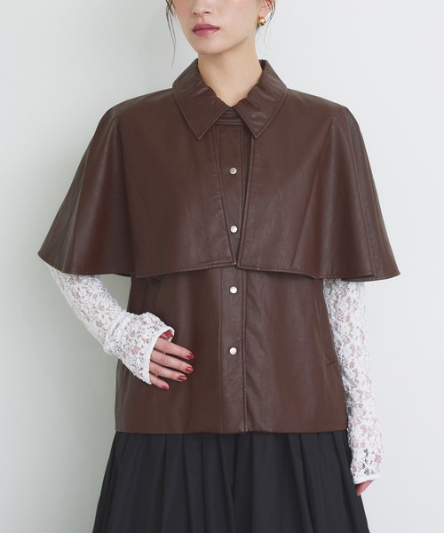 フェイクレザーケープベスト 【ポイント】 存在感のあるレザーにケープデザインを掛け合わせた、モード感漂うアイテム。ケープを取り外すとシンプルなベストとしても着用でき、デザイン性と着回し力を兼ね備えています。ベーシックアイテムのコーディネートを新鮮に演出し、スタイリングの幅を広げてくれるアイテム。 【デザイン・シルエット】 ケープ付きで着用すると、動くたびに揺れるシルエットが印象的で、羽織るだけで高級感を纏えるデザイン。ケープを外すとコンパクトなベストに変わり、すっきりとしたラインを活かしたスタイリングが楽しめます。2WAY仕様が魅力の、コーディネートに変化を取り入れることができる万能デザイン。 【おすすめのスタイリング】 スラックスやデニムと合わせればスタイリッシュに、ロングスカートと組み合わせればモードの中にも女性らしいバランスを演出。タートルネックやレース素材のトップスと合わすとアクセントを加えることができ、雰囲気を変えて楽しむことができます。インナー次第でシーズンを問わず活躍し、幅広いシーンに馴染む着回しができるのも嬉しいポイント。 【素材】 上質感があるフェイクレザーを使用しているので、グッと引き締まったシャープな印象をプラスする素材感。しっかりとした風合いながらも柔らかさを持ち、着心地の良さも兼ね備えた、長く愛用できる一枚。 ※ご覧のモニター環境や撮影環境により実の商品と多少色味が異なって見える場合がございます、ご理解の程を宜しくお願い致します。 ▼商品のお気に入り登録をおススメ致します☆サイズやカラー横のハートマークをクリック! 完売カラーの再入荷や、ラスト1点の通知、セールの際の通知を受ける事ができます。 お気に入り登録も宜しくお願い致します♪