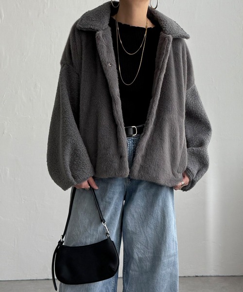 フェイクファーとボアを組み合わせた異素材ミックスのコクーンブルゾン。 ふんわりとしたボリューム感とあたたかみのある素材で、冬のコーディネートに新鮮な表情をプラスします。 【素材】 やや光沢あるフェイクファーとボアの切り替え。 【デザイン】 コクーンシルエットのブルゾンです。 【ポイント】 やや大きめの襟と袖で切り替えたボア使いがポイントのブルゾン。 全体的にフェイクファーですが、やさしい仕上がりになるように各パーツや素材にこだわりました。 ※ブラックに付属のATTENTION 札について 通常のご使用においては問題ございませんので、ご安心ください。濡れたままの放置や、淡色のものとの“強い”こすれなどで色移りする場合がありますのでご注意ください。