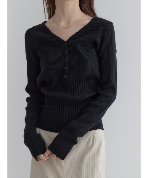 【RE ARRIVAL】【デザイン&ディテールポイント】スカラップラインのVネックと、ヘンリーネックのボタン使いがコーデのアクセントに。ネックラインからボタン部分までスカラップラインが施され、女性らしい柔らかなデザイン。深めのVネックはデコルテを綺麗に見せ、上品な肌見せが叶います。ウエストまでの細リブは体のラインに程よくフィットし、リブの切り替えデザインもポイントに。【コーディネートポイント】ボトムスアウトでの着用で、リブの切り替えデザインをコーデのアクセントに。タイトスカートやマーメイドスカートに合わせて、ナチュラルな大人フェミニンスタイルに。アイボリー、チャコール、ブラックの3色展開。