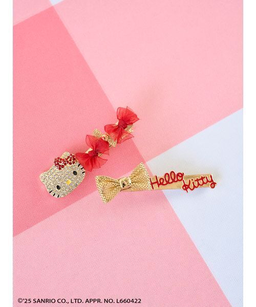 【ハローキティとSNIDELの初コラボで登場した限定ゴールドヘアピン2本セット】【Design/Styling】世界中で愛され続けているハローキティと20周年を迎えたSNIDELとの初コラボレーション。ここでしか手に入らないスペシャルキュートなキティのゴールドヘアピン2本セットが到着。キラキラビジューをあしらったキティのフェイスに、サイドにSNIDELらしいシフォンリボンをあしらったヘアピンと、Hello Kittyのロゴにゴールドラメ入りリボンをあしらったヘアピンの華やかなセットアイテムです。リボンやロゴの色が異なるレッドとブルーの2色展開。ギフトにもおすすめです。※照明の関係により、実際よりも色味が違って見える場合があります。またパソコン・スマートフォンなどの環境により、若干製品と画像のカラーが異なる場合もございます。予めご了承ください。商品の色味は、商品単品画像をご参照下さい。 ※商品画像はサンプルのため、色味やサイズ等の仕様に変更がある場合がございますので、予めご了承ください。