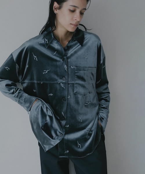 2025 Autumn&Winter Collection ベロアエンブロイダリーシャツ ベロアシャツとアウターの中間のシャウター。 ノスタルジックな雰囲気漂うリーフモチーフのオリジナル柄を刺繍加工したベロア生地。 全面芯仕様と裏地仕様でハリ感を持たせ体に張り付かないジャケットライクに仕上げています。 シャツのきちんと感が苦手な方も気軽に羽織りやすいデザインです。 中にニットも着れるくらいのオーバーサイズシルエットと、裏地付きなので暖かさも兼ね備えています。 同素材のオールインワンとセットアップで着たり腰に巻いていただくのもおすすめです。 ※照明の関係により、実際よりも色味が違って見える場合がございます。 またパソコン・スマートフォンなどの環境により、若干製品と画像のカラーが異なる場合もございますので、予めご了承ください。 商品の色味は、商品拡大画像をご参照下さい。