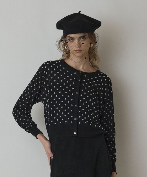 レーヨン・ナイロン・ポリエステルの合繊素材を、薄く軽く編み立てたハイゲージニットカーディガン。 薄手でも糸質に拘り、暑い時期にもさらっと着ていただける初秋にぴったりな一枚に仕上げました。 最大のポイントは製品加工で入れたドットフロッキープリント。 ベースにラメが少し入り、取り入れるだけでクラシカルな秋の雰囲気を演出します。 前後どちらでも着られる2WAY仕様も◎ カーディガンとしてもトップス感覚でも、またウエストで巻いたり肩掛けでアクセントにしたりと様々なコーディネートをぜひお楽しみください。 ※こちらのモデル着用画像はサンプル品を撮影しております。実際の商品と仕様、加工、サイズが若干異なる場合がございます。予めご了承くださいませ。 洗濯表示 洗濯不可 漂白不可 タンブル乾燥不可 アイロン不可 弱いドライクリーニング(石油系)可
