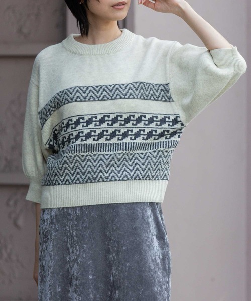 □ 2025 AUTUMN & WINTER COLLECTION □ ◆丸みのあるフォルムとパフスリーブが女性らしいノルディック柄のコンパクトニットトップス◆ <MATERIAL> ウールナイロンの紡毛糸。 繊維が細く、柔らかさと微光沢を持ち合わせたラムウール混で、カサっとした表情と柔らかな手触りのバランスが良く、編み目がくっきりと出て保温性の高い糸です。 ウール30%と少な目ですが、しっかりとウールの暖かみを感じられ、程良い毛羽感もあり、秋から真冬まで対応できる素材感です。 身頃部分は5GGのシングルジャカードでノルディック柄に編み立て、袖部分は7GGのダブルジャカードで少し張りを持たせた編地に編み立てる事で、ボディーと肉感を合わせ、ゲージや編地が違っても違和感のない組み合わせに仕上げています。 <DESIGN> 身頃の裾側に配したノルディック柄はノスタルジックな印象になり過ぎないバランスとシックな配色でこなしているのがポイント。 敢えて顔周りや袖には柄を入れず、大人っぽくまとめました。 比較的厚手のニットですが、肘くらいの丈の短めのパフスリーブなので、立ち上がりに1枚でさらりと着こなして、季節感を取り入れたコーディネートもおすすめですが、軽めのアウターを羽織ったり、定番のリブインナーやシアーインナー、ブラウスやシャツなどをレイヤードすれば冬まで長く着られます。 <COLOR> ■アイボリー:明るく柔らかなベースにダークグレーの柄でナチュラルで優しい雰囲気 ■チャコールグレー:ダークグレーにブラック&ホワイトの柄でシックでモードな印象 ■ボルドー:深みのある赤系にブルー&グレーの柄でレトロ感とモダンさを両立 ※光のあたり具合いやパソコンなどのモニター環境によって実際の色味と異なって見える場合がございますので、予めご了承ください。 ※着用商品はサンプルです。サイズ等の仕様に若干の変更がある場合がございますので、予めご了承ください。 ※お取扱いについては、商品についております品質表示、アテンションタグにてご確認ください。 洗濯:手洗い可 .............................≪INFORMATION ≫............................ ▼商品のお気に入り登録▼ 『♡』マークを押してお気に入り登録して頂いた商品は、セール開催の通知やクーポン発行などのキャンペーンなど、お得な情報をいち早く受けとる事が出来ますので、ぜひご登録ください。