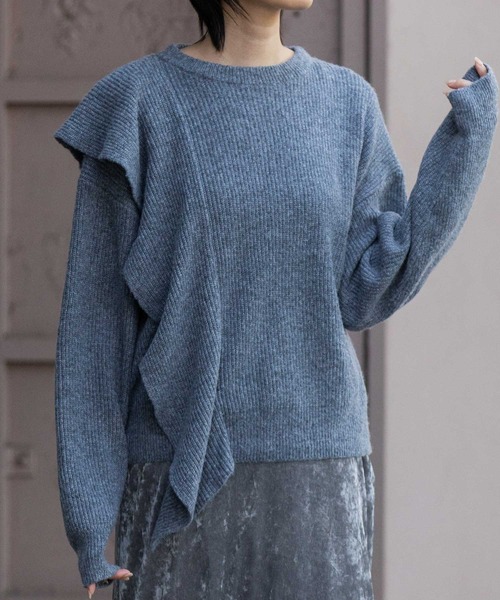 □ 2025 AUTUMN & WINTER COLLECTION □ ◆ニット編みでフリルをデザインした一枚で主役になる女性らしいニットトップス◆<MATERIAL>環境に優しいサスティナブルな繊維リサイクルポリエステルに、ウールとナイロンを混紡した細番手の紡毛素材。ニットならではの柔らかさと、ふわりとした空気を含んだ様な軽やかさが特徴です。また、保温性と通気性にも優れており、ほのかな毛羽感と暖かみがありながら暑苦しさのない着やすい素材感に仕上がっています。多本取りで編み立てた7GGの片畦編み。ふっくらとした厚みと表面感のある編地に仕上げています。柔らかさと暖かさがを持ち合わせた程よい素材感です。<DESIGN>右肩のフリルデザインがポイントのデザインニット。甘さのあるフリルデザインを、ふっくらとふくらみのある片畦編みでこなすことで、きれいな落ち感とドレープ感が出て大人っぽい印象に。アシンメトリーデザインがほんのりモードな雰囲気で、コーディネートにアクセントがつくアイテム。スカートと合わせてエレガントにも、パンツと合わせてすっきり着こなしても決まるアイテムです。<COLOR>■グレー:甘さ控えめで大人っぽいニュートラルなグレー■ライトベージュ:肌なじみが良く上品なやや黄みのある柔らかいベージュ■ネイビー:ラッフルがより際立つ深みのある濃紺※光のあたり具合いやパソコンなどのモニター環境によって実際の色味と異なって見える場合がございますので、予めご了承ください。※着用商品はサンプルです。サイズ等の仕様に若干の変更がある場合がございますので、予めご了承ください。※お取扱いについては、商品についております品質表示、アテンションタグにてご確認ください。洗濯:手洗い可.............................≪INFORMATION ≫............................▼商品のお気に入り登録▼『♡』マークを押してお気に入り登録して頂いた商品は、セール開催の通知やクーポン発行などのキャンペーンなど、お得な情報をいち早く受けとる事が出来ますので、ぜひご登録ください。