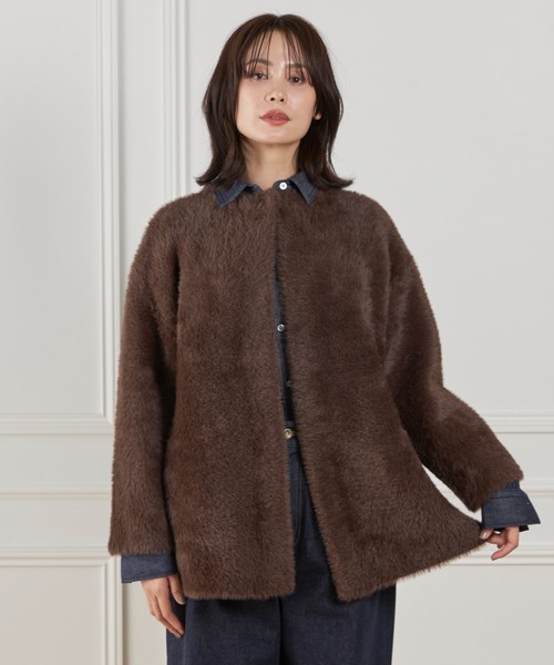 ■デザイン たっぷりとしたシルエットで抜け感を意識した大人のニットコーディガン。毛足の長いフェザーヤーンは羽織るだけで華やかなコーディネートになります。さらっと着流していただくのはもちろん、衿元のスナップボタンを留めて雰囲気を変えてお楽しみいただくのもおすすめです。裏側をポリエステルにすることでインナーに毛がつきにくくなる工夫をしています。両脇ポケットあり。ハンガー脱落防止の吊りテープあり。 ■素材 今シーズンもトレンドのフェザーヤーン。軽くてソフトな素材で、思わず触りたくなるふわふわとした表面感と肌触りのよい質感が特徴です。ポリエステルの糸とダブルフェイスにすることでしっかりとした肉感になり、型崩れしにくく美しいシルエットを保ちます。 ・水洗い可 ■サンプル撮影商品 画像の商品はサンプルです。実際の商品とはサイズや色味、素材、デザイン等の仕様が若干変更になる場合がございます。