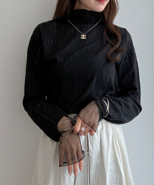 ほんのり透け感のあるシアー素材にジャカード柄をのせたロンT。袖部分はメッシュ切り替えで軽やかなアクセントを加え、タートルネックが首元をすっきりと演出します。ニットやスウェットのインナーに重ねるだけで、着こなしに奥行きをプラス。【素材】ジャカード柄が入ったシアー素材。袖メッシュ。【デザイン】くしゅっとしたタートルネックと袖は長めメッシュの切り替えロンT。【ポイント】ニットや裏毛のインナー使いに活躍するロンTです。ジャカードのシアー素材のため、暑すぎず、でも透けすぎない使いやすいアイテムにしました。