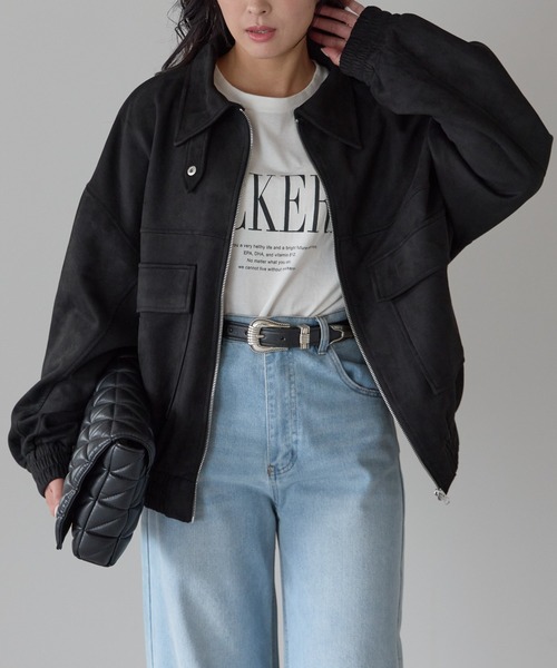 ◆ミリタリーテイストに女性らしさをプラス◆【ディテール】襟のタブデザインがおしゃれなフライトジャケット。スタンドカラーにも出来る2Way仕様。フロントジップと大きめなポケットがミリタリーな雰囲気。【ファブリック】上品なスエードポンチ素材は起毛感とさり気ない光沢が魅力で、カジュアルすぎず大人っぽく仕上がります。【スタイリング】さらりと羽織るだけでシーズンムードをプラスしてくれる、便利なライトアウターです。
