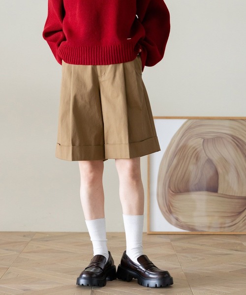 着回し力抜群のきれいめハーフパンツ◎■おすすめの着こなし☆カジュアルな着こなしには・・・ロゴTやプリントT×ブルゾンのラフ過ぎない着こなしが◎スウェットやパーカーに合わせて、とことんメンズライクなスタイルもおすすめです。☆きれいめな着こなしには・・・ギャザーシャツやブラウスと合わせる、クリーンなスタイルがおすすめ。レザー素材のアイテムと合わせれば、大人らしいきれいめスタイルも叶います◎■ポイント幅広いスタイルと相性抜群のハーフパンツ。ピーチ加工を施した素材なので、チノパンツながらもカジュアルすぎない仕上がりに。裾部分はロールアップデザインなので、さりげないアクセントになります。程よくワイドなシルエット×タックデザインなので、穿くだけでスタイルアップ効果も◎どんなコーデにも合わせやすく、ロングシーズンお使いいただけること間違いなしなアイテムです。■素材柔らかく、肌触りの良いコットンとポリウレタンの混紡素材を使用。穿き心地も良く、ノンストレスで着用いただけます。