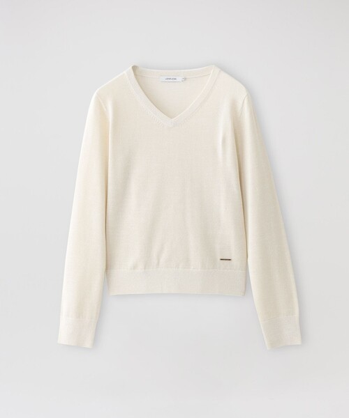 ハイゲージのVネックプルオーバーニット【素材】柔らかなブレンドウール素材を使用し、クリアな表面感と滑らかな肌触り。ハイゲージで編み立てることによりツヤ感が生まれ、上品な質感が特徴。ラメ糸が加わることでさりげない華やかさがプラスされています。上質な素材ながらもご自宅で手洗い可能なイージーケアも嬉しいポイントです。【シルエット/デザイン】デコルテを美しく見せてくれるVネックデザインが、衿回りをスッキリとした印象に。適度なゆとりのあるシルエットなので、一枚着としてはもちろんですが、ジャケットやコートのインナーとしても着用可能です。裾のLOVELESSロゴメタルプレートがさりげないアクセントになっています。【スタイリング/その他】パンツにもスカートにもバランスよく合わせることができる万能トップス。シンプルなので、ネックレスを上から重ねて首元をポイントにしたスタイリングがおすすめ。トレンドに左右されないベーシックで汎用性の高いアイテムはワードローブのマストアイテムに。━━━━━━━━━━━━━━━━━━━━━━━━━━お買い物をお楽しみ頂くために<商品のお気に入り登録>完売カラーの再入荷通知など、お得な情報をお届けします。<注意事項>この商品はサンプルでの撮影を行っています。実際の商品とイメージが異なる場合がございます。撮影環境により、光の当たり具合で色味が違って見える場合があります。あらかじめご了承下さい。