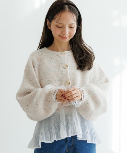 ■デザインカラースプレーのような糸がトッピングされた、ハッピーな雰囲気のニットカーディガン♪大きめボタンがデザインのアクセントに♡■デザインショート丈の身頃×ボリューム袖のシルエットがスタイルアップを叶えてくれます!ラメ糸を引き揃え、特別感のある一枚に仕上げました。ハッピームードたっぷりのIvoryと、華やかながらも落ち着いた印象のBeige♪雰囲気が異なる二色をご用意しました。デイリー使いやイベントにぴったりなアイテム♡■おすすめコーディネートショートパンツ×ブーツと合わせればトレンド感のあるコーディネートが完成!大人っぽく着こなしたい方はclassic pleats blouseなど、ブラウスとのレイヤードスタイルがおすすめです◎■flower/フラワー「love&joy」をコンセプトに、商品に愛を込め、お客様に楽しんでいただけるような、ナチュラルでガーリーなアイテムを提案していきます。【お買い物を上手にお楽しみいただくためのPOINT2つ】◎ 購入ボタン横の ♡ (ハートマーク)をクリック! 完売カラーの再入荷通知、残り1点の通知、セールの通知を受け取れます。 (クリックまたはタップで商品のお気に入り登録♪)◎ ショップのトップページにある ♡ (ハートマーク)「お気に入りショップに追加」をクリック! 新商品や再入荷等、いち早くブランドのお得な情報を受け取れます。 (ブランドのお気に入り登録♪)