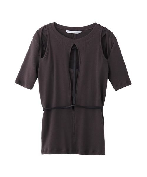 ストラップ付きクロップドタンクトップと4分丈スリットトップスのレイヤードトップ。セパレート仕様で、別々でも着用が可能。また、付属のランジェリーストラップは着脱でき、2着を絡めての着用も可能。伸縮性がありやわらかな肌触りのテレコ素材。