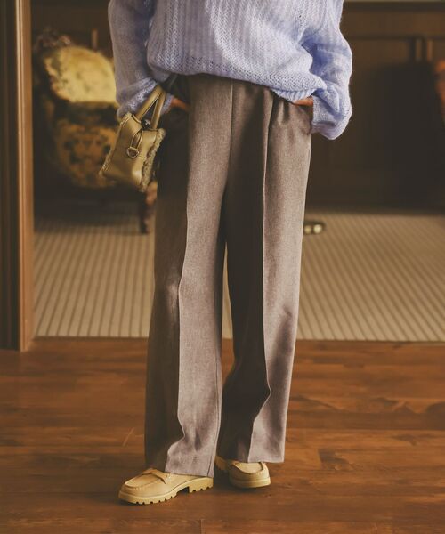 ツイードライクな表情が魅力のイージーパンツです。●ポイント起毛感は無く、さらっとしたポリエステルの素材でホームクリーニング可能なのも嬉しいポイント。●おすすめコーデ着こなしによってオールシーズン着まわし可能です。センタープレス入りで、きれいめにも使いやすいデザインでオンオフ問わずお使いいただけます。※取り扱いについては、商品についている洗濯表示にてご確認下さい。※照明の関係により、実際よりも色味が違って見える場合がありますまたパソコン・スマートフォンなどの環境により、若干製品と画像のカラーが異なる場合もございます。※商品の色味は、商品アップ画像をご参照ください。【注意事項】・画像の商品はサンプルです。・サイズ表記はあくまで目安となります。実際の商品と仕様、加工が若干異なる場合があります。