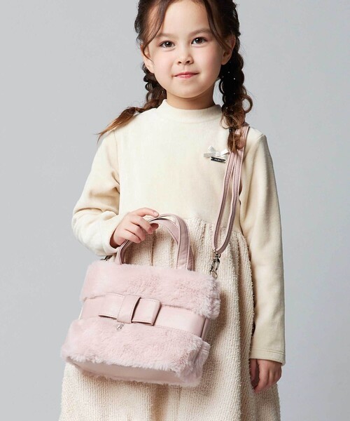 -25AW- ミニトートとショルダーの2通りに使えるおでかけバッグ。 ■デザイン うさぎさんのようなふわふわフェイクファーに大きなリボンモチーフがアクセントになっています。 ベルト部分はフェイクレザーで素材感の違いがおしゃれです。 ショルダーベルトは長さ調節可能でナスカンで簡単に取り外しできます。 ドレッシーに使いたいときにはミニトートで、普段使いにはショルダーでポシェット感覚で使えます。 リボンモチーフの下のロゴチャームもデザインポイントです♪ ■素材/機能 毛足の柔らかなフェイクファーとマットな質感のフェイクレザーを使用。 裏地は光沢感のあるサテン生地になっています。 口にはマグネットのスナップボタン付きで簡単に開閉できます。 25秋冬 女の子アイテム 【2025年秋冬 シーズンテーマ】 -クルーズ・私の行く先- レストランやブティック・劇場・図書館にカフェまるでひとつの街のように巨大な架空の豪華客船での船旅をイメージしたコレクション。 上質さや品の良さをベースに遊び心や楽しさをプラスしたブルジョワシックなスタイルを提案します。 【BeBe(べべ)】 ”LOVE MODERN” 少しおませで、生意気なヨーロピアンカジュアルの提案。 時代性・流行性をとらえ、ベーシックでもワンポイントを施した遊び心、楽しさを盛り込んでいます。 シンプルだけど、こだわりのあるオリジナリティーを重視しています。