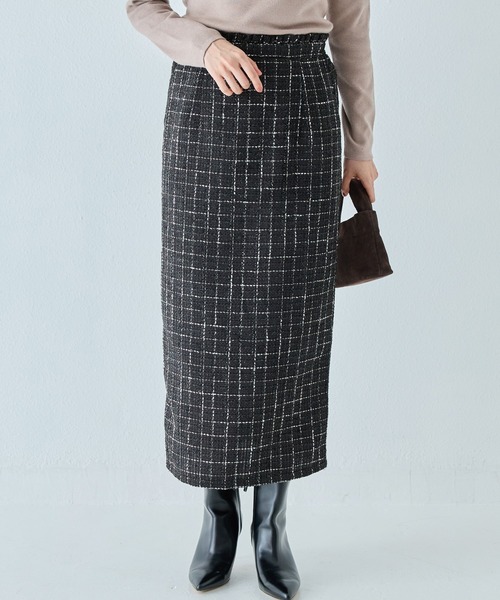表面感のあるファンシーモールツイード生地を用いたペンシルスカート。秋冬向きのやや厚手生地ながら、ストンとした直線的なシルエットで下半身をスッキリ綺麗に見せてくれます。スリット(ラメ)糸を織り交ぜ、格子柄のように見える奥行きのある織り柄を表現。ウエストはバックゴム仕様で着脱もラクチン。普段使いから通勤・食事会など、さまざまなシーンで活躍しそうな一枚です。*豊富なマルチサイズ展開/大きいサイズ対応(M/L/LL)*オフィスカジュアル/通勤服/リモートワークにも◎*自宅で洗濯可能(手洗い・ドライ)◆INCEDE◆■商品注意事項■※商品画像は、光の当たり具合やパソコンなどの閲覧環境により、実際の色味と異なって見える場合がございます。予めご了承ください。※末永く愛用頂く為に、アテンションタグ・洗濯ネームを必ずご確認の上、着用又はお取り扱い下さい。※生産時期により色味が多少異なる場合がございます。予めご了承ください。