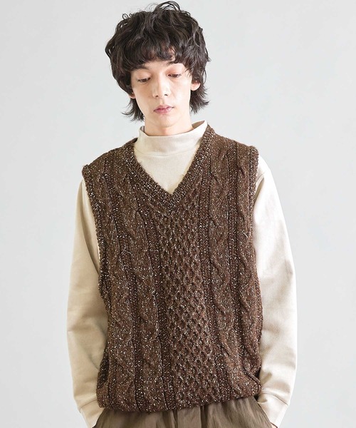 “秋冬のレイヤードに、ほどよいアクセントを。”【デザイン】・ネップ糸を使用したケーブル編みVネックベスト。・袖がないのでロンTやシャツ、ブルゾンやジャケットに差し込みやすいデザイン。・ホワイトネップがさりげないアクセントとなり、冬のアメリカンテイストを演出。・まだ暑い時期から着用できる、長いシーズン活躍するアイテム。【コーディネート】・ロンTやシャツに重ねて、秋らしいレイヤードスタイルに。・ブルゾンやジャケットのインナーに差し込めば、コーディネートに立体感が生まれます。・デニムやスラックスとも相性が良く、カジュアルからきれいめまで幅広く活躍。model:180cm size:L