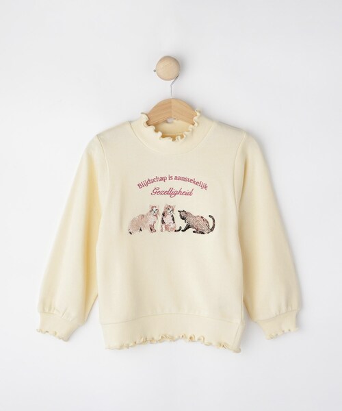 【デザイン】リブ先のフリルデザインが可愛いスウェットトップスです。フロントには人気の猫モチーフとスイーツモチーフそれぞれが刺繍でデザインされ、コーデの主役になる存在感!スカートに合わせてガーリーにも、カジュアルにパンツ合わせでもどちらも可愛く着こなせちゃいます。【素材】ほどよい肉感で柔らかい風合いのガーゼ裏毛を使用しています。※照明の関係により、実際よりも色味が違って見える場合があります。また、パソコン・スマートフォンなどの環境により、若干製品と画像のカラーが異なる場合もございます。店舗へのお問い合わせ商品番号:122-14331●製品寸法:10(100cm):着丈34cm B60cm 袖丈31cm 肩幅24cm11(110cm):着丈37cm B64cm 袖丈36cm 肩幅26cm12(120cm):着丈39cm B67cm 袖丈40cm 肩幅27cm13(130cm):着丈41cm B70cm 袖丈44cm 肩幅28cm14(140cm):着丈43cm B73cm 袖丈48cm 肩幅29cm15(150cm):着丈45cm B76cm 袖丈52cm 肩幅30cm備考: