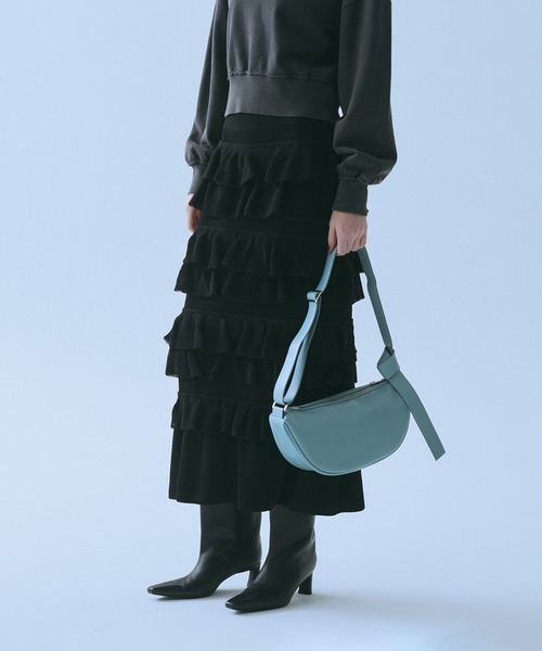 《定番人気・イージーケア》存在感のあるフリルに視線集中すること間違いなし。女性らしい甘さと、伸縮性のある楽な着心地を兼備したロングニットスカート◆25AW◆ ADAM ET ROPE' FEMME【Material】スカート:リサイクルポリエステルの糸を使用した、適度な厚みのある裏総針編みニット。フリル:ナイロンとポリエステルの透け感の出る糸で編み立てた片畦フリル。【Design】フリル感で華やかに着映えるニットスカート。スカートの編み地は伸縮性があり、ウエストのゴム仕様でストレスフリーな着用感。フリルは段々に配して、スタイルアップのバランスが計算された1着。フリル編みの表情のあるギャザーデザインが、きれいめになりすぎず、モードに甘く着こなせるように仕上げたアイテム。※昨年にご好評いただいた(品番:GAC24100)と同型・新色追加アイテムです。【Color】モードなフェミニンさを演出できるブラックとグレー、赤味の焦茶の3色展開。【Styling Point】シアートップスやシャツ、スウェットなどウエストインもアウトも幅広いトップスと好相性。足元はスニーカーで外したり、ブーツでスタイリッシュにまとめたスタイルもおすすめ。カジュアルシーンから、パーティ?シーンまで着回しが楽しめるニットスカート。---------------透け感:なし裏地:なし伸縮性:あり光沢感:フリル編みのみ微光沢生地の厚さ:中肉ポケット:なし---------------◇モデル情報身長:163cm size:F(ブラックヘア)身長:175cm size:F(ブロンドヘア)
