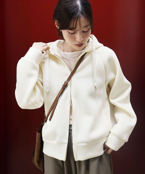 一枚あると重宝する、キレイ目派にぴったりのスウェットフードパーカー。もっちりとしたダンボール素材×ゴールドパーツ使用で綺麗め要素を盛り込んだ女性らしさたっぷりのデザインです。●ポイントダブルジップで着こなしに幅が出ます。カジュアルアイテムが苦手な方でも着ていただける一押しアイテムです。●おすすめコーデ羽織りとしてはもちろん、キャミソールを合わせてジップを調整し、主役として着ていただくのもおすすめ。ジャケットやコートのインナーとしても着られるサイジングでレイヤードスタイルも楽しめる着回し力抜群のアイテムです。