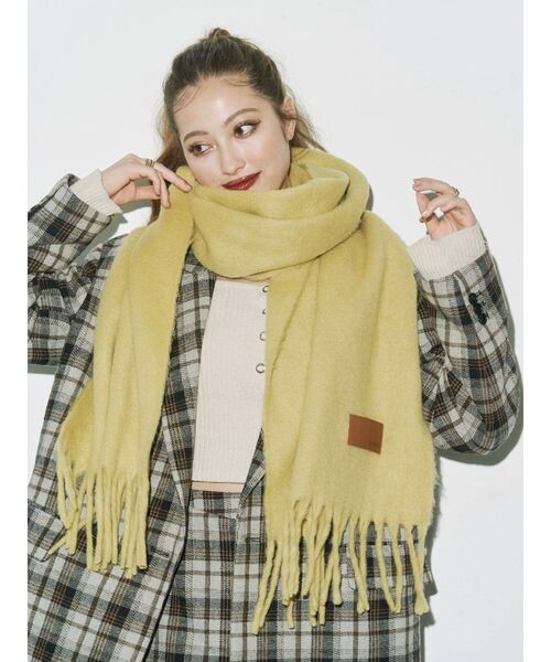 緩く起毛がかかったシャギーマフラーです。 横幅が45cmあるのでかなりボリューム感のあるマフラーで、スタイリングを華やかにするアイテムです。 左側のフリンジ上にはEVRIS(エヴリス)オリジナル皮パッチを付けておりワンポイントに。