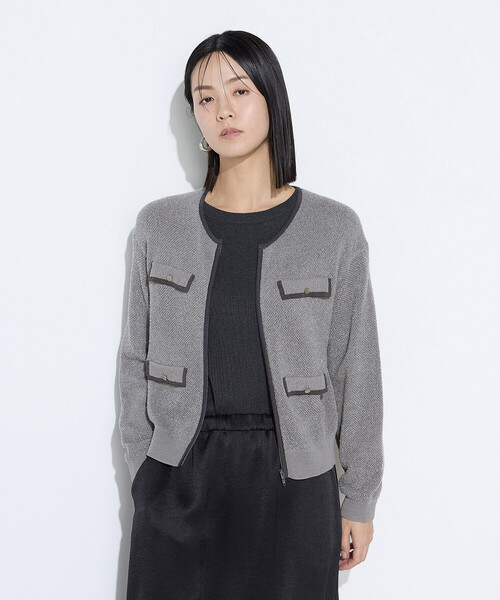 《デザイン》バイカラーのパイピングと見せかけのフラップポケットがポイントのモールジャカードジップアップカーディガンです。軽くてしわになりにくく、通気性もあるので、まだ暑さが残る秋にも重宝していただけます。体から適度に離れたボックスシルエットですが、リブが縮んで腰まわりにフィットするので、すっきりとスタイリングしていただけます。上からも下からも開けることができる逆開ファスナーなので、裾側を開けてプリーツスカートなどのボリュームのあるボトムに合わせたり、スタイリングのバリエーションが広がります。《素材》毛足があるモール糸とハリ、コシがある擬麻コットンを使用し、メッシュ状のジャカード編みにしたモールジャカードニットです。どちらの糸も去年のモールジャカードカーディガンよりも細い糸をピックアップすることで、ダレ感を軽減します。さらっとした肌触りの編地にすることで、できるだけ季節を問わず着られるよう工夫しています。裏側の肌にあたる部分は、編み組織によって表もフラットな状態になっています。表は凸凹感があってよく見ると透け感があり、カラミ織りのような表情のある編地になっています。《お手入れ方法》手洗い可能です。軽く押し洗いして絞る時は弱くお願いします。タンブラー乾燥はお避け下さい。