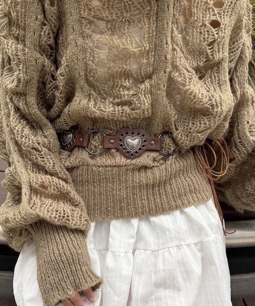 コーデのポイントに!個性派ベルトグランジコーデに欠かせないベルト♪太目でインパクトのあるデザインは、コーディネートのポイントに。ウエストに巻くだけでコーディネートが格上げされます。コンチョやハトメのインパクトと、可愛いハートが共存するデザイン◎[Point]○トップスの上からウエストマークとして使っても◎○つけるだけでトレンド感を演出