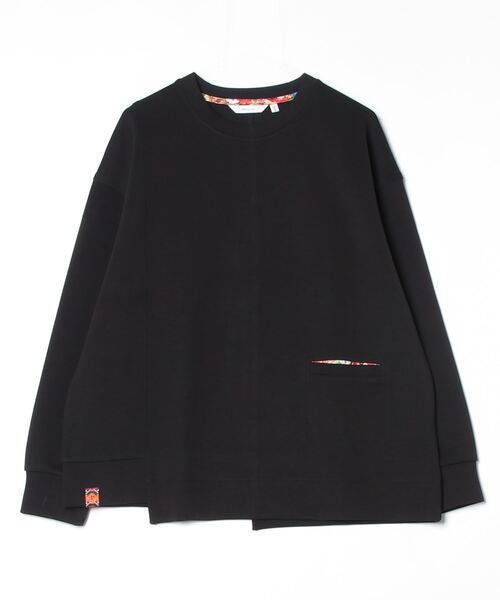 【 生地 】スポンジを包み込んだようにふっくらと柔らかく、かつ着た瞬間からわかる軽さが特徴的なダンボール素材を使用しています。柔らかさを際立たせるためシリコン系柔軟を使用しポリウレタン糸を組み合わせることでストレッチ性の高いキックバックもある万能タイプの生地です。ツルツルとした滑らかさで、高級感ある表情が特徴的です。シワがつかないイージーケアの素材なのでワードローブに取り入れやすい素材です。【 デザイン・シルエット 】スウェットのような見え感でハリがあり、上品さを兼ね備えた肉厚な素材ダンボールニットを使用したカットソーです。身幅袖周りともにワイド目にとっており男女共にゆったりとした着こなしがお楽しみいただけます。ボディー部分は切り替えを入れ段差をつけフロントのスリットポケットの内側は花柄生地を使用するなど遊び心を盛り込んだデザインになっております。