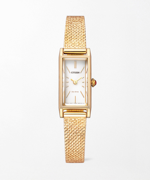 CITIZEN KiI - デザイン ハンサムな印象の長角ケースにカーブガラスを合わせた、オーセンティックなデザイン。文字板はすっきりとした印象のバーインデックスを採用し、小さめサイズながらも見やすさにこだわりました。メッシュバンドには、クラシカルな雰囲気をより一層高める風合いのあるパターンを施しました。 - ディテール ・Ref:EG7043-50W ・ケース素材:ステンレス / GP ・ブレス素材:ステンレス / GP ・ガラス素材:クリスタルガラス ・ムーブメント:エコドライブ / ソーラー電池 ・フル充電時:約8か月駆動 ・平均月差:±15秒 ・形状:レクタンギュラー ・防水性:日常生活防水 ・保証期間:3年間 / MY CITIZENご登録により5年間 ・付属品:ボックス / 保証書 ・保証書 / 購入明細について 保証書と購入明細は合わせてご保管をお願いいたします。修理ご希望の際は、保証書と購入明細をご提出ください。購入明細はマイページ上から閲覧・印刷していただけます。 ・MY CITIZENについて MY CITIZENは、腕時計を安心してご愛用いただくためのシチズンの会員制サービスです。対象商品をご登録いただくことで延長保証などのさまざまな特典をご利用いただけます。 ・エコドライブ機能について シチズンが独自に開発した光を電気エネルギーに変換し、時計を駆動させる技術です。定期的な電池交換不要のエコドライブ搭載のモデルは、時計として初めてエコマーク商品に認定されました。充電不足にならないよう暗所でのご保管はお避けください。 ・サイズ調整について HIROB各店舗にて承っております。店舗の状況やモデルによりお時間をいただく場合や、弊社工房でのお預かり対応になる場合がございます。 ・CITIZEN Kii /シチズン キー CITIZEN Kiiは、アンティークな雰囲気とスマートな機能性を合わせもつ女性のためのウォッチコレクション。華奢なサイズ感のジュエリーライクな見た目ながら、すべてのモデルにエコドライブ機能=ソーラー電池を搭載しています。