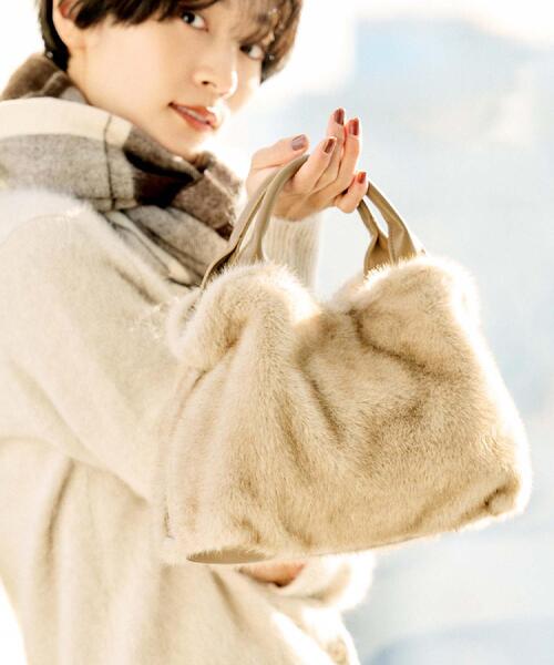 【デザイン】ミニサイズのフェイクファーバッグ。クロスボディーショルダー付きで使いやすさも◎です。素材はリッチな印象の毛足の長いフェイクファーで、温かみのある質感が魅力。表側のポケットはメタルのファスナーがワンポイントに。機能性も充実しています。コーディネートに冬のアクセントを加えるフェイクファーバッグは、自分へのご褒美やギフトにも最適です。【コーディネート】ストレートパンツと合わせてカジュアルスタイリングにアクセントをプラス。シックなブラウスやニットと合わせてオフィススタイルにも。【仕様】・ポケット数:内側×2※照明の関係により、実際よりも色味が違って見える場合があります。また、パソコン・スマートフォンなどの環境により、若干製品と画像のカラーが異なる場合もございます。店舗へのお問い合わせ商品番号:153-04050●製品寸法:FREE:高さ20cm 幅(上部)31cm 幅(下部)31cm マチ16cm 持ち手上がり10cm 付属ショルダー対応サイズ80~91.5cm備考:重量:約335g(サンプルサイズ)