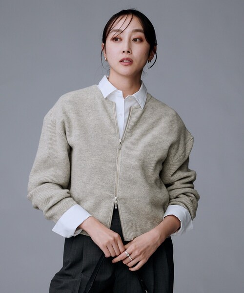 【デザイン】軽やかさとふくらみのあるニット素材のクルーネックジップカーディガン。少しゆったりとしたサイジングに短めの着丈でボトムスとのバランスを取りやすく、さりげなくスタイルアップを実現。トレンド感あふれる逆開ファスナー仕様は下を少し開けてインナーを見せたり、レイヤードスタイルに抜け感とこなれ感を演出してくれます。同素材のニットワンピースの展開有り。(商品番号:153-54553)【素材感】一部にリサイクル繊維を使用したウール混とリサイクル・ナイロンをミックスして作られ、軽さや膨らみが特徴の全色TOP染色で紡績されたイタリア(【MILLEFILI】社)製の紡毛糸。■ライトグレー(611):ライトグレー(011)に比べ若干の黄味がございます。【着こなしポイント】同素材のニットワンピースにカーディガンを羽織り、スニーカーを合わせたリラックスカジュアルなスタイリングもおすすめ。シャツやブラウスに羽織って逆開ファスナーを少し開けて、インナー見せると、こなれたスタイルになります。※照明の関係により、実際よりも色味が違って見える場合があります。また、パソコン・スマートフォンなどの環境により、若干製品と画像のカラーが異なる場合もございます。モデル情報:身長163cm B80 W59 H82 着用サイズ:02(M)店舗へのお問い合わせ商品番号:153-34553●製品寸法:00(XS):着丈48cm B92cm 袖丈48cm 肩幅47cm02(M):着丈51cm B102cm 袖丈49cm 肩幅51cm04(2LT):着丈55cm B108cm 袖丈50cm 肩幅54cm44(3L):着丈55cm B116cm 袖丈49cm 肩幅56cm48(5L):着丈55cm B124cm 袖丈48cm 肩幅60cm備考: