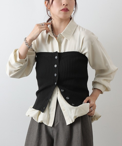 【レイヤードにオススメ◎】縦ラインのリブ編みが印象的なニットビスチェです。 フロントのボタンディテールがアクセントになっています。 コンパクトなシルエットでレイヤードスタイルにもぴったり。 いつものアイテムにプラスするだけで、ガラッと印象を変えられます。 シーズンレスに取り入れられる万能アイテムです。 【商品ポイント】・ロングシーズン着用可能・さまざまなアイテムと相性抜群・いつものコーデにプラスするだけでガラッと雰囲気チェンジ◎----------------------------------------------------■商品特徴洗 濯 方 法 :手洗い可裏 地 :なし透 け 感 :なし伸 縮 性 :あり光 沢 感 :なし生地の厚さ:普通----------------------------------------------------■素材ポリエステル79%, アクリル14%, ナイロン7%----------------------------------------------------※着用、お取り扱いの際は、商品についている品質表示とアテンションタグを必ずご確認下さい。※商品タグに記載されている商品名がWEBでの表記名と異なる場合があります。※実際の商品と仕様、加工、サイズが若干異なる場合がございます。※照明の関係により、実際よりもやや明るく見える場合がございます。またパソコンなどの環境により、若干製品と画像のカラーが異なる場合もございます。予めご了承くださいませ。【お気に入り登録】してお得な情報をCHECK!!・「商品のお気に入り登録」で再入荷通知や、ラストの通知、セール通知も受け取ることができます。・「ブランドのお気に入り登録」で新商品や再入荷など、お得な情報を受け取ることができます。