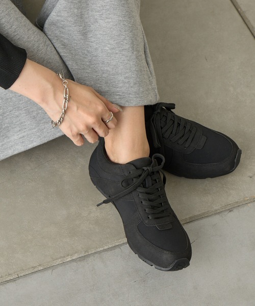【ナイロン×スエードの大人っぽスニーカー】 ナイロンとスエードの素材感が大人っぽさを引き出すスニーカーです。 全体をブラックで統一しているので足元が締まります。 さりげないブランドタグもワンポイントになっています。 靴ひもをアレンジして自分の好きな雰囲気に変えてもかわいいです◎ 【商品ポイント】 ・シックなブラックカラー ・ナイロン×スエードの素材が大人っぽい ・使いやすいデザイン 【素材についてのご注意】 こちらの商品は、スエード風のやわらかい風合いをいかした素材を使用しています。 素材の特性上、摩擦や汗・雨などで濡れた状態では、まれに色落ち・色移りが起こる場合がございます。 特に、白や淡いカラーのお洋服・バッグと合わせる際は、ご使用の環境にご注意いただけますと安心です。 気になる場合は、ご着用前に目立たない部分で軽くこすっていただき、色移りがないかご確認ください。 ---------------------------------------------------- ■素材 甲材: 合成繊維 底材: 合成底 ---------------------------------------------------- ※着用、お取り扱いの際は、商品についている品質表示とアテンションタグを必ずご確認下さい。 ※商品タグに記載されている商品名がWEBでの表記名と異なる場合があります。 ※実際の商品と仕様、加工、サイズが若干異なる場合がございます。 ※照明の関係により、実際よりもやや明るく見える場合がございます。 またパソコンなどの環境により、若干製品と画像のカラーが異なる場合もございます。予めご了承くださいませ。 【お気に入り登録】してお得な情報をCHECK!! ・「商品のお気に入り登録」で再入荷通知や、ラストの通知、セール通知も受け取ることができます。 ・「ブランドのお気に入り登録」で新商品や再入荷など、お得な情報を受け取ることができます。