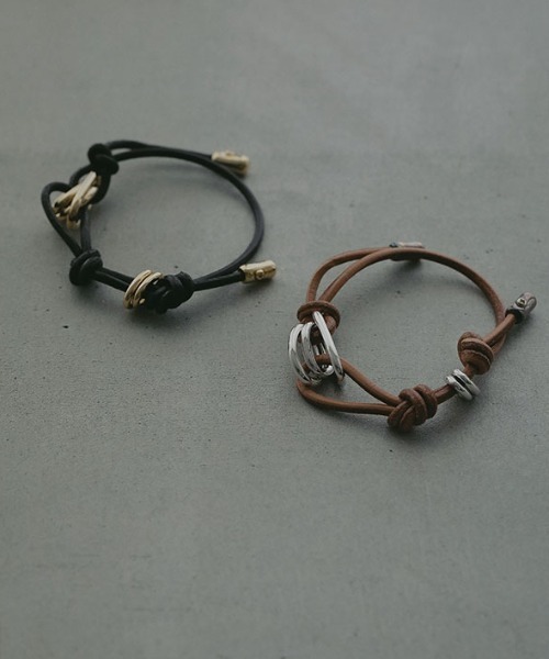 存在感のあるメタルパーツと、ナチュラルな風合いのレザーコードが絶妙なバランスで組み合わさったレザーコードバングル ベースには日本製のヌメ革を使用し、使い込むほどに味わいが増していくのも魅力のひとつ。 コード部分はスライド式でサイズ調整が可能、自分の手首に合わせてフィット感を調節いただけます。 重なり合う3つのメタルフープと剣先のメタルパーツが、さりげなくも印象的なアクセントに。 ゴールドとシルバーの光沢が、レザーの柔らかな質感を引き立てます。 これからの季節はニットやロングスリーブの上から重ねて、さりげなく手元にアクセントをプラスするのもおすすめ。 シンプルなカジュアルスタイルの引き締め役としても活躍してくれるバングルです。 ーーーーーーーーーーーーーーーーーーー ※縦、横は一番大きい金具のサイズで表記しております。 ーーーーーーーーーーーーーーーーーーー ▼商品のお気に入り登録 お気に入りアイテムの再入荷や残り1点の通知を受け取ることが出来ます ▼ブランドのお気に入り登録 新作アイテムの入荷や人気アイテムの再入荷、 タイムセールやクーポンなど、いち早くブランドのお得な情報を受け取ることができます ーーーーーーーーーーーーーーーーーーー ※画像の商品はサンプルです。 ※商品を使用前に、タグ等に記載されている「取り扱い上の注意書き」、「洗濯表示」を必ずご確認ください。 ※商品画像は、光の当たり具合やパソコンなどの閲覧環境により、実際の色味と異なって見える場合がございます。 ※商品の色味は、スタジオ撮影の画像をご参照ください。