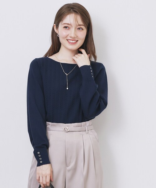 身頃のケーブル編みと袖口のボタンがポイント上品で着回しやすいボートネックニット【デザイン】・身頃には繊細なケーブル編みを施し、立体感と上品さを演出。シンプルながらも存在感のあるデザインです。・袖部分は天竺編みで仕上げ、異素材感が楽しめるバランスの良いデザイン。 袖口にはボタンをあしらい、さりげないアクセントをプラス。・ボートネックがデコルテを美しく見せ、女性らしい柔らかな印象を与えます。・裾はリブ仕様で、タックアウトしてもバランスよく着こなせるのがポイント。【素材】・柔らかく滑らかなニット素材を使用し、肌触りが良く快適な着心地。・マシンウォッシャブル仕様で、お手入れが簡単。 デイリー使いにぴったりのアイテムです。・抗ピリングの素材なので毛玉ができにくく、美しい状態を長くキープ。※照明の関係により、実際よりも色味が違って見える場合があります。また、パソコン・スマートフォンなどの環境により、若干製品と画像のカラーが異なる場合もございます。モデル情報:身長163cm B81 W56 H82 着用サイズ:38(M)店舗へのお問い合わせ商品番号:C58-14011●製品寸法:34(XS):着丈47cm B78cm 袖丈55cm 肩幅29cm36(S):着丈49cm B82cm 袖丈56cm 肩幅31cm38(M):着丈50cm B86cm 袖丈57cm 肩幅33cm40(L):着丈51cm B90cm 袖丈58cm 肩幅35cm42(LL):着丈52cm B94cm 袖丈59cm 肩幅37cm備考: