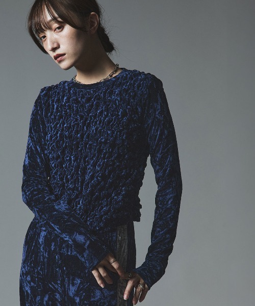 【セットアップ可能】 クラッシュベロアシャーリングトップス -Design- クラッシュベロアにシャーリングを施し、立体感をプラスしたコンパクトトップス。 短めの丈と細身のシルエットで、コンパクトなシルエットが魅力です。 首元はラウンドネックで、インナーとしての着用にも合わせやすくて◎ 同生地を使用した「クラッシュベロアサイドラインスカート」「クラッシュベロアサイドラインパンツ」とセットアップで着用いただけます。 -Fabric- ベロア生地の毛並みに動きのでる加工を施した、立体的で光沢感のあるクラッシュベロア生地を使用。 伸縮性が高く、程よく肌にフィットするため、スウェット感覚で着用いただけます。 ご自宅でのお洗濯が可能です。 ------------------ 透け感:なし 厚さ:中薄地 伸縮性:あり 裏地:なし ポケット:なし ------------------ 【ATTENTION】 ※お洗濯時は、手洗いで水温30℃以下を推奨いたします。 ※アイロン掛け時は、あて布をご使用ください。 ___________________________ -W:Huku 2025AW- 『plus Manish』 レディーなのにどこかクール 可憐なのにボーイッシュ W:Hukuが提案する ニューレディーな秋冬の装い ___________________________ 【W:Huku】 時計の分針のように刻々と変わりゆく服【Huku】のトレンド。 そんな時代に生きる私【W】は、時針のようにのんびりでもいい、急がなくてもいい。 けれど、変化を受け入れる強さがある。 Don’t be afraid of time changes. 【注意事項】 ※平置き・メジャー採寸ですので若干の誤差が生じる場合がございます。 ※撮影時のライティング、ご覧になっているモニター・pc環境により実際の商品と色味が異なって見える場合がございます。 ※機械による生産過程において商品によっては染料の性質上、多少の生地を織る際の糸の継ぎ目・繊維が混紡・ほつれ・接着剤付着・臭い等が生じる場合が御座います。 ※生地や素材の特性上、匂いが感じられるものもございますが陰干しなどで匂いはほとんど感じられなくなります。 ※商品をお安く提供させて頂く為、検品後のアイロン掛けは省略させて頂いております簡易梱包の為、たたみシワがあると思いますが、ご了承ください。 ※ご注文いただいた予約商品のお届け時期の確認は、注文履歴ページより行えます。 ※他のキャンペーンにより、期間中に価格が変動する場合があります。 ※セールは予告なく終了させていただく場合もあります。