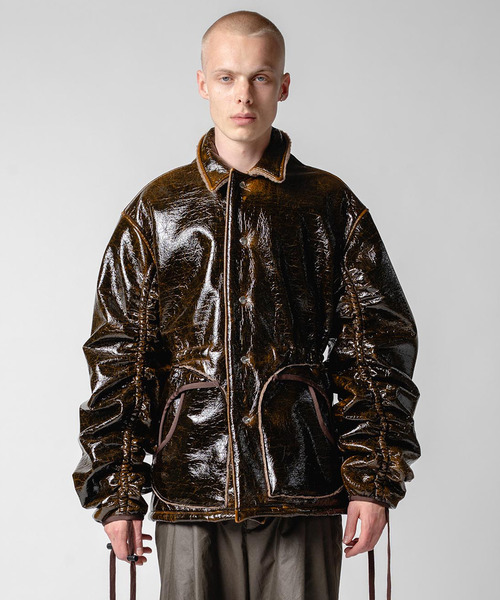 光沢感のあるレザー調素材と丸みを帯びたビッグシルエットが印象的な主役級のアウタージャケット。 袖口のスピンドルにより、袖丈とギャザーの分量を自在にコントロール可能。 ウエスト内側のドローコードで調整でき、気分やコーディネートに合わせてシルエットの変化を楽しめる。 フロント両サイドの流線形ポケットは、実用性とデザイン性を兼ね備えたyoshiokuboらしいディテール。 一枚でスタイリングの主役となる存在感で、カジュアルからモードスタイルまで幅広いシーンで活躍する。 ■素材の特徴 ・ボア素材にラミネート加工を施し、エナメルを彷彿とさせる美しい光沢感を実現 ・クラッシュ加工により立体的な表情と奥行きのある風合いを演出 ■素材の質感 透け感:なし 裏 地:なし 伸縮性:なし 光沢感:あり 生地の厚さ:厚い その他:袖、裾にドローコードあり、ポケットあり yoshiokubo デザイナー自身の“今まで見た事のないパターンやディティールを追求したい” という気持ちを、クチュール時代に培った技術を駆使し自身のコレクションに投影させている。 またそれは決してひとりよがりのものでなく着た人に“服のデザインやディテールをもう一度考えてもらいたい”という願望のもと上質なパターン、きめ細かな縫製技術をベースに、一貫して衣服としての機能を重視した着心地の良い日常着を提案している。 リピーターも非常に多く定番展開となるタックパンツやセットアップスタイルのアイテム、ビッグシルエットのトップスやワイドパンツも展開。