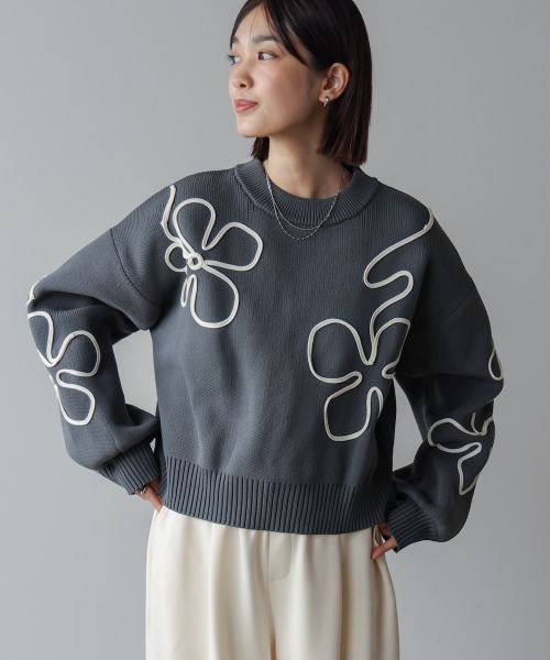 ■POINT 注目のコード刺繍が目を惹くショート丈ニットです。ニュアンスのあるフラワーモチーフを立体的なコード刺繍であしらった、鮮度の高い1枚。ボリューム袖やリブ編みの切り替えなど、シルエットにもメリハリをつけたのがポイント。着るだけで華やかさがUPするデザインニットです。 ■FABRIC 程よいハリが魅力のスポンディッシュ生地を使い、ニット自体にも立体感を持たせました。 ………………… 透け感:なし 裏地:なし ………………… ★商品のお気に入り登録 登録すると、完売しても再入荷時に通知を受け取ることができます。 ほかにもお得な特典があるかもしれません♪ ★ブランドのお気に入り登録 新商品や再入荷などの情報を受け取ることができますので、是非ご登録ください♪