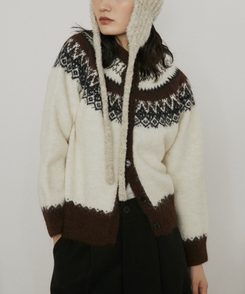 クラシカルなノルディック柄が目を惹く、クルーネックカーディガン。 ■デザイン/素材 ふんわりとした起毛感が見た目にもあたたかく、シーズンムードを高めるカーディガン。 裾や袖口、ネック部分を配色で切り替えて、柄がより引き立ち全体のバランスがきれいに見えるデザインに。 程よくゆとりのあるシルエットで、襟周りはシンプルで合わせやすいクルーネックにしているため、抜け感のあるレイヤードが叶います。 ウール混の柔らかな糸を使用しているので、チクチクしにくく、伸縮性のある軽やかな着心地で秋冬のスタイリングにぴったりの1着。 ■スタイリング Tシャツやキャミソールの上からラフに羽織るのがおすすめ。 程よいゆとりは持たせつつだらしなく見えないショート丈のサイズ感で、ワイドパンツと相性抜群です。 …………………… 透け感 : 無し 厚さ:普通 伸縮性:あり お手入れ方法:手洗い推奨 …………………… ※ご注意※ ・屋外の光や照明の当たり具合で、実際の商品の色味と カラー別画像の色味に若干の違いが発生する場合がございます。 ・詳細画像と併せてご確認の上、ご注文いただきますようお願い致します。 【MERLOT】 肩の力が抜けた都会的なライフスタイルをテーマにレディースからユニセックスまでジャンルレスに展開。 ファッションとカルチャーを織り交ぜた、それぞれの生活に馴染むルーズなスタイルを提案します。 【商品のお気に入り登録】 完売カラーの再入荷通知やラスト1点の通知、プライスダウンの通知を受け取ることが出来ます。 【ブランドのお気に入り登録】 新商品や再入荷など、嬉しい情報を受け取る事が出来ます。 ぜひご登録ください◎ ストリート/シティ/シティボーイ/シティガール/メンズライク/テック/ノームコア/古着ライク/ カジュアル / トレンド / オールシーズン /秋服/冬服/ユニセックス
