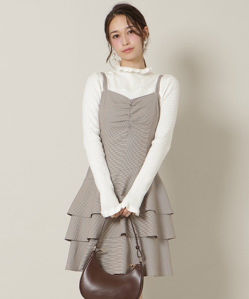 ミニワンピで楽しむレイヤードスタイルコーデ 【Design】 ・コーディネートにガーリーなエッセンスを加えるミニワンピース。 ・フロントギャザーとダブルストラップでアクセントをプラス♪ ・ウエストはスッキリと仕上げ、裾はティアードデザインでボリューム感を演出してくれます。 ・インナーを変えることでロングシーズン着回していただけます! ・ロングブーツと相性抜群のミニ丈アイテムです。 ・後ろはゴム仕様で伸縮性のある仕上がりです。 ・肩紐はアジャスター付きなので、長さの調整が可能◎ ・左ファスナー仕様。 【Fabric】 ・しなやかさのあるポリエステル素材を使用。 ・裏地付き。 ・ご自宅でお手入れが出来るのも嬉しいポイント♪ ・ブラウンチェック、チャコール、ブラックチェックの3色展開になります。 【Care】 手洗い可能 F:(00):着丈86cm/身幅44.5cm/ウエスト70cm/ヒップ96cm/裾回り175cm