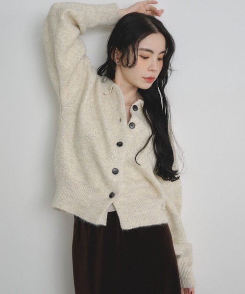 【Shelly island /シェリーアイランド】《detail》・上品な輝きが魅力のスパンコールポロカーディガン。・ふんわりとしたブークレ調の生地に、繊細なスパンコールを散りばめることで、控えめながらも華やかさを演出。・襟付きのポロデザインで、程よくきちんと感をプラスしつつ、カジュアルにもフェミニンにも対応。・ゆったりシルエットで、インナーとのレイヤードも楽しめ、ボタンを閉じて1枚着としても、羽織としても活躍。・秋冬の主役カーディガンとして、デイリーからお出かけシーンまで幅広く対応する一枚です。《fabric》・透け感:なし・裏地:無し・伸縮性:やや有り・生地の厚さ:普通◆商品のお気に入り登録【♡】登録のお勧め!完売カラーの再入荷通知やラスト1点の通知プライスダウンの通知も受け取ることができます。ぜひご登録ください◎◆ブランドのお気に入り登録新商品や再入荷など、ブランドの情報をいち早くお知らせします!ぜひご登録ください◎※この商品は、摩擦や、汗・雨などによる水ぬれにより色落ちが生じる場合がございます。 衣服や周囲のものに色移りする恐れがありますので、白色や淡色のものと組み合わせる際は、十分にご注意ください。※繊細なお作りとなっております。引っ掛けにご注意ください。※強く引っ張たり、強い力をかけると引き裂けのの原因となります。 ご着用の際はお取り扱いに十分ご注意ください。※撮影環境により多少実際のカラーと異なる場合がございます。※生産時期により若干の色ブレやサイズの変動が生じる場合がございます。※表示のサイズ感と実物は異なる場合もございます。上記ご了承の上、お買い求め下さいませ※Webサイト上・商品タグ・洗濯タグそれぞれのカラー・サイズ表記が異なる場合がございます。