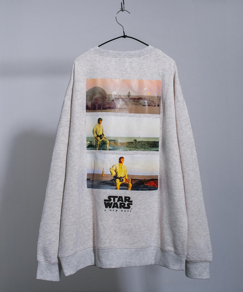 スター・ウォーズ エピソード4 新たなる希望 裏起毛トレーナー Star Wars: Episode IV A New Hope ジョージ・ルーカスが製作し、1977年に公開された同名の映画から始まるアメリカのスペースオペラシリーズ。 スター・ウォーズ エピソード4 新たなる希望からタトゥイーンで双子の夕日を見るルークスカイウォーカーをバックプリントに施した当店オリジナルデザインの裏起毛トレーナー。 ※正式なライセンス契約を結んでいるアイテムとなります。