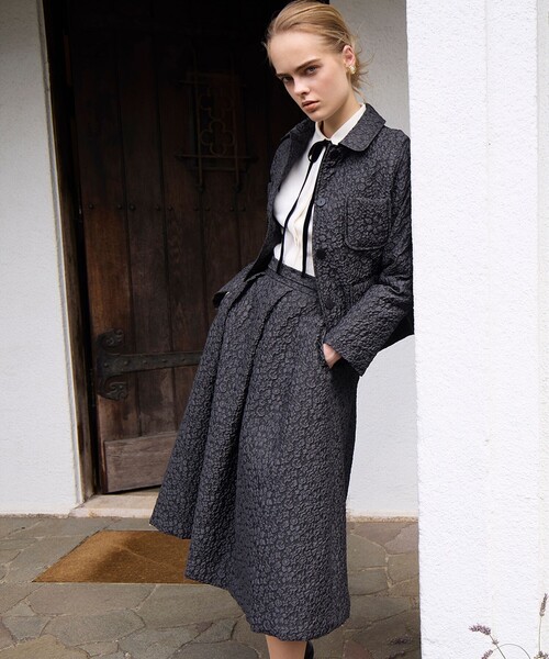 大人の洗練を纏う■デザイン女性らしい品格を際立たせる中綿入りジャケット。甘すぎないフラワージャカードがシックな印象をもたらします。■コーディネート同素材のスカートとセットアップで着こなせば、パーティーやディナーにも映える華やかなスタイルに。シンプルなインナーと合わせるだけで、特別感のある大人の装いが完成します。■ディテール丸みを帯びた襟と、フロントの大きめポケットがアクセントに。■サイズ立体感がありながら大きすぎないシルエットで、すっきりと上品に羽織れる1枚。やや短めの着丈がウエスト位置を高く見せてくれます。■素材米沢産の膨れジャカード生地を使用。立体感のあるテキスタイルと、グレーと黒のコントラストがクラス感のある表情を演出します。■ケア方法ドライクリーニング可(詳細は商品についている洗濯表示タグをご覧ください。)●セットアップで着用可能なスカートもございます品番:64-27-1526-825H171 B77 W59 H87 Size:38**********************生地の厚さ:普通透け感:なし伸縮性:なし光沢感:ややあり裏地:あり**********************※光の当たり具合やパソコンなどの閲覧環境によって、実際の色味と異なって見える場合がございます。予めご了承ください。※商品の色味は商品単体で撮影した画像をご参照ください。
