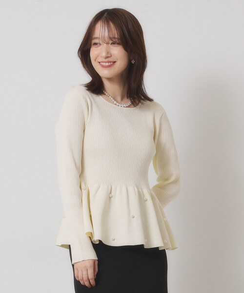 【デザイン】大粒のパール調ディテールが華やか。コンパクトめなボトムと相性良いペプラムニット。美しいシルエットを作れる、ハリ感のあるスポンディッシュポリエステル糸を使用。一枚で華やかさのある着映えするデザインです。タイトスカートなどのコンパクトめなボトムと合わせてすきりと着こなすのが◎きちんと感があるデザインなのでオフィスシーンにもおすすめです。【素材】さらりタッチで軽さのあるポリエステル糸を使用。※照明の関係により、実際よりも色味が違って見える場合があります。また、パソコン・スマートフォンなどの環境により、若干製品と画像のカラーが異なる場合もございます。----------------------------------------★お気に入り登録がおすすめ★▽気になる商品はハートマークをクリック!・再入荷やセールの通知をお知らせ・お気に入り一覧からいつでもチェック▽ブランドのお気に入り登録も!・新商品やお得な情報をいち早くお知らせ----------------------------------------モデル情報:身長166cm B80 W59 H85 着用サイズ:00(フリーサイズ)店舗へのお問い合わせ商品番号:P93-14028●製品寸法:00(フリーサイズ):着丈56cm B74cm 袖丈56cm 肩幅35cm備考: