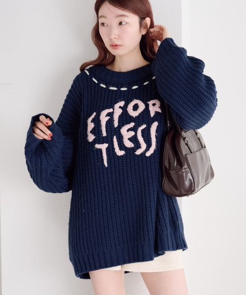 存在感たっぷりのハンドステッチロゴニット■デザイン立体ロゴが目を惹く、ハンドステッチニット。ゆったりとしたシルエットとざっくり編みの柔らかい素材感で、カジュアルながらもこなれた印象に。首元のステッチデザインと手縫いのようななロゴが魅力的な一枚。■生地感チクチクしにくく、軽やかな着心地。暖かさもあるので真冬にもぴったり。■コーディネート大きめシルエットなので、ミニ丈ボトムが今年らしいスタイリングに。すっきりとした細身ロングボトムとも相性◎アウターの中からロゴを見せるのもおすすめです。■素材・洗濯表示素材:アクリル 100%洗濯:手洗いまたは洗濯ネットに入れ洗濯機の手洗いコースで洗濯可能タンブル乾燥:不可アイロン:120℃まで※素材の特性上、洗濯により若干縮むことがあります。※汗や水、摩擦により他のものに色移りすることがありますのでご注意ください。※サイズ採寸は各モールによって異なり、多少の誤差が生じる可能性がありますのでご了承ください。※撮影画像はサンプル品を使用しているため、実際の商品とカラー、仕様、加工、サイズが若干異なる場合がございます。使用しているパソコンのモニター設定や、携帯電話のメーカー・機種により実際のカラーと異なって見える場合がございます。予めご了承ください。▼商品のお気に入り登録ハートマークをクリックし、お好きなカラーを選んでお気に入りに登録完売カラーの再入荷通知や、ラスト1点の通知、セールの通知も受け取ることができます。▼ブランドのお気に入り登録新商品や再入荷等、いち早くブランドのお得な情報を受け取ることができます。<返品・キャンセルについて>・着用・洗濯後の返品・ご交換は致しかねます。・商品到着後、着用前に商品を確認して頂きますようお願い致します。