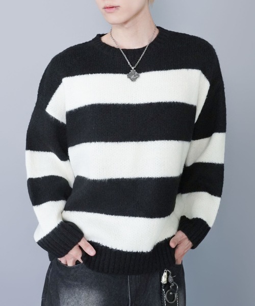 【DESIGN/デザイン】存在感抜群の太めボーダーが印象的なモヘアタッチニット。ゆったりとしたシルエットにドロップショルダーを掛け合わせることで、今っぽい抜け感を演出します。シンプルながらも1枚でコーデが決まる主役級アイテムで、ストリート、韓国、古着MIX、グランジなど幅広いテイストにマッチ。レイヤード次第で秋冬〜春先までロングシーズン着用でき、ユニセックスで楽しめる万能ニットです。ボーダーニットを探している方にもおすすめの、トレンド感と着回し力を両立した1枚。【FABRIC/素材】モヘアのようなふんわりとした毛足と柔らかさが特徴のアクリル混素材を使用。軽くて暖かく、チクチクしにくい快適な着心地が魅力です。厚みのあるしっかりとした編み地で、存在感ある1着です!※掲載画像(商品、モデル着用とも)につきまして、撮影環境やお客様の閲覧されますパソコンや携帯電話キャリアによって、実際の商品とは多少異なった色に見える場合があります。また表示のサイズ感も実物とは若干異なる場合もございますので、予めご了承ください。※タグ・バーコードのついたシールには、サイトのご案内と異なるカラー名が記載されていることもございます。ご了承ください。- - - - - - - - - - - - - - - - - - - - - - - - - - - -【「お気に入り登録」でお得な情報が届きます】・「商品のお気に入り登録」で再入荷通知、ラスト1点の通知、セール通知などを受け取ることができます。・「ブランドのお気に入り登録」で新商品、人気アイテムの再入荷など、お得な情報を受け取ることができます。- - - - - - - - - - - - - - - - - - - - - - - - - - - -