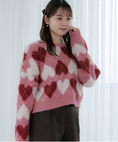 ■デザインとっても華やかなハート柄の主役級ニットトップス♡ふわふわシャギーの糸と弾力のあるアクリル混の糸を引き揃えて柔らかくもっちりとした肌触りに♪ハートとひし形を掛け合わせたアーガイル柄をジャカード編みで表現しました。両色それぞれの色バランスを調整し、ガーリーでハート柄が映える配色でお作りしました♡首元はデコルテが見えるすっきりとした開き具合で骨格を問わずに着ていただけます。デイリー使いやデート、イベントにぴったりな一枚です!※着用画像はサンプルを使用しており、格子線の太さが異なります。実際にお届けするものは詳細画像のものになります。■おすすめコーディネートデニムなどカジュアル素材のボトムスとの合わせが◎ミニスカートと合わせてトレンドライクなスタイリングもお楽しみください♪■flower/フラワー「love&joy」をコンセプトに、商品に愛を込め、お客様に楽しんでいただけるような、ナチュラルでガーリーなアイテムを提案していきます。【お買い物を上手にお楽しみいただくためのPOINT2つ】◎ 購入ボタン横の ♡ (ハートマーク)をクリック! 完売カラーの再入荷通知、残り1点の通知、セールの通知を受け取れます。 (クリックまたはタップで商品のお気に入り登録♪)◎ ショップのトップページにある ♡ (ハートマーク)「お気に入りショップに追加」をクリック! 新商品や再入荷等、いち早くブランドのお得な情報を受け取れます。 (ブランドのお気に入り登録♪)