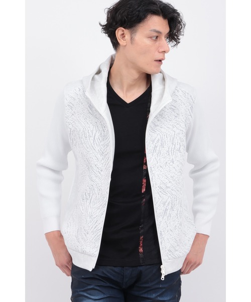 <DESIGN> ジャカードモールニット、フェイクスエード、リブニットを贅沢に組み合わせたショートフーディブルゾン。 ビーストの毛並みを思わせるジャカードモールニットと、陰影感のあるフェイクスエードを掛け合わせることで、ブランドならではのモード感とスポーティさを両立。異素材の妙が際立つ一着です。 <TEXTILE> • 【前身頃】フクレジャカードモールニット • 【後身頃】ポリエステル度詰めミラノリブ • 【袖】ポリエステル度詰め2×1リブ • 【フード・脇・裾】スエードタッチのポンチ素材にムラ柄プリントを施したフェイクスエード
