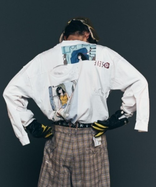 SEVESKIG SEVESKIGとイラストレーター江口寿史氏がタッグを組んだコラボレーションT-shirt。 代表作『ストップ!! ひばりくん!』でも知られる江口氏のクールでポップなタッチで描かれた少女が、スクーターにまたがる印象的なグラフィックで登場。 江口寿史氏のグラフィックを大胆にプリントしたTシャツを解体・再構築し、 パッチワークで仕立てたロングスリーブTシャツ。 前後で異なるイラストが織りなすズレや重なりが、唯一無二の存在感を放ちます。 SEVESKIG・・・“ありそうでないもの”をコンセプトとしたレザーを中心としたコレクションはテーラリングに裏付けされたパターンからなる構築的なデザインと、VINTAGEに見られる質感を融合させ一人の職人が全行程を行う“丸縫いレザー”という前代未聞の商品を展開する。 大事なのは MADE IN JAPAN であること。 日本の革職人の確かな技術に、デザイン・加工という遊び心を加える。 将来自分たちが作った服が、買ってくれたお客様の子供、さらにはその孫たちにも着てもらえることが目標。 大手アパレルメーカー経験後、東コレブランド、国内ドメスティックブランドのディレクション兼MDを担当したディレクター。 同じく大手アパレルメーカーから国内ドメスティックブランド、フリーランスで数々のブランドのデザインで活躍したデザイナー。 大手アパレル在籍、ロンドンのSavile Rowで修行の経験を持つパタンナーの3人がスタートさせる。