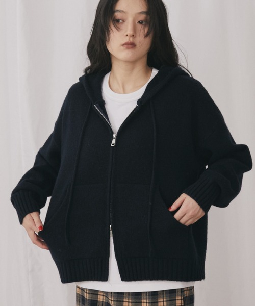 トレンド感のあるダブルジップがポイントのニットパーカー■デザイン/素材ダブルジップ仕様で着こなしの幅が広がるニットパーカー。フロントのジップを開け閉めするだけで印象を変えられ、気温やコーディネートに合わせて調整可能。長めにデザインした首元の紐はベーシックなパーカーのさりげないアクセントに。程よくリラックス感のあるドロップショルダーで、抜け感を出しつつ肩まわりも窮屈感なく着用いただけます。柔らかく肌触りの良い素材感で、デイリーからちょっとしたお出かけまで幅広く活躍する一枚。■スタイリングダブルジップを生かしてインナーのカットソーを見せるのがおすすめ。気温が低い時期にはアウターのインナーとしてレイヤードすることで奥行のあるスタイリングがお楽しみいただけます。……………………透け感 : 無し厚さ:普通伸縮性:ありお手入れ方法:手洗い推奨……………………※ご注意※・屋外の光や照明の当たり具合で、実際の商品の色味とカラー別画像の色味に若干の違いが発生する場合がございます。・詳細画像と併せてご確認の上、ご注文いただきますようお願い致します。【MERLOT】肩の力が抜けた都会的なライフスタイルをテーマにレディースからユニセックスまでジャンルレスに展開。ファッションとカルチャーを織り交ぜた、それぞれの生活に馴染むルーズなスタイルを提案します。【商品のお気に入り登録】完売カラーの再入荷通知やラスト1点の通知、プライスダウンの通知を受け取ることが出来ます。【ブランドのお気に入り登録】新商品や再入荷など、嬉しい情報を受け取る事が出来ます。ぜひご登録ください◎ストリート/シティ/シティボーイ/シティガール/メンズライク/テック/ノームコア/古着ライク/ カジュアル / トレンド / オールシーズン /秋服/冬服/ユニセックス