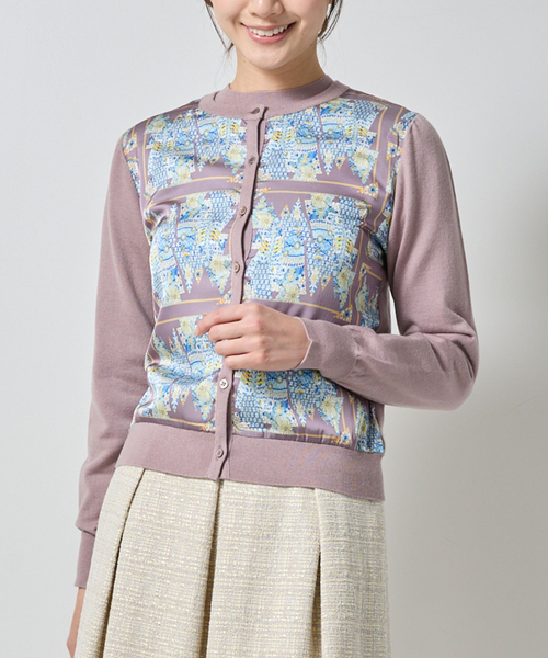 ジーニアスコラボプリント×ニットシリーズのカーディガン。エレガントな印象のサテンベースのプリントは、ニットと組み合わせることでラフにも着こなせるアイテムに仕上げました。グレーのようなシックな配色は、同系色のアウターと組み合わせることで、ソフトで上品な大人のニュアンスカラーコーデを完成させられます。フロントボタンの開閉によっても雰囲気の変化を楽しめるアイテムです。同シリーズのプルオーバー(30-52-11-939)とレイヤードコーデも楽しめます。 ・カラー展開はグレー、ベージュ ・サイズ展開は1(M)9号・3(2L)13号・4(3L)15号