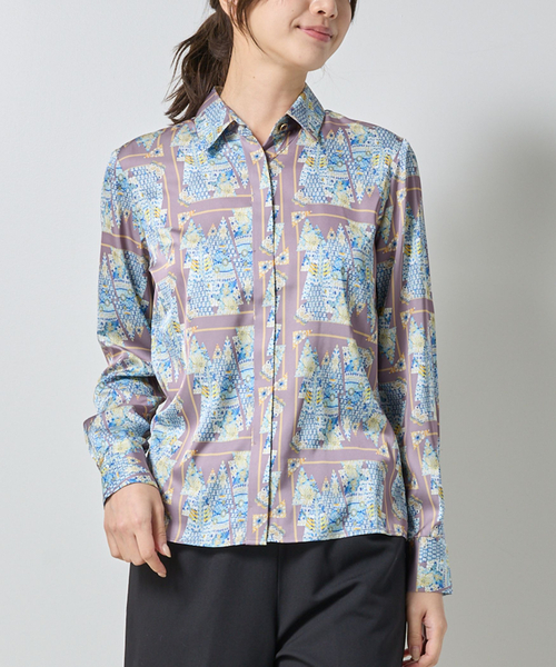 ジーニアスとコレボレーションした長袖シャツ。『森』がコラボレーションテーマとなっており、秋冬の静かな森が色づく様や、そこに生きている木々や動物達が描かれています。程よく光沢感のある生地にプリントされた絵柄は、上品で華やかなムードを演出。シンプルな無地のボトムスと合わせた、バランスの良いコーディネートがおすすめです。 ・透け感なし ・ストレッチなし ・カラー展開はグレー、ベージュ ・サイズ展開は0(S)7号・1(M)9号・2(L)11号・3(2L)13号・4(3L)15号・5(4L)17号